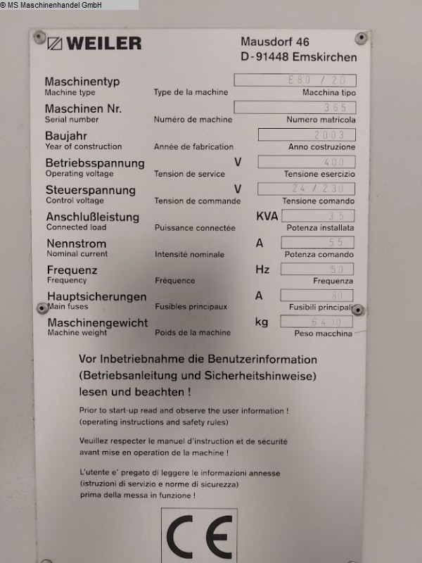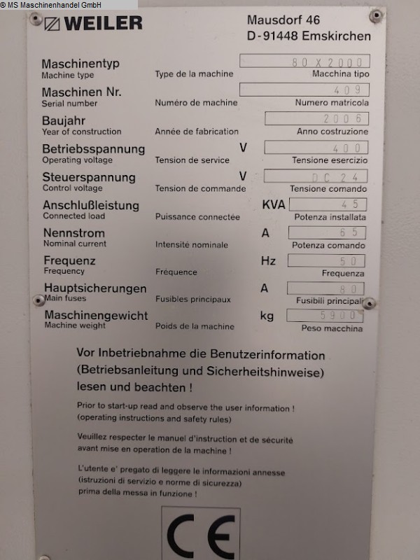 Gebrauchte Weiler Drehmaschine-zyklengesteuert TYP E80 x 2000 Bj. 2003 sofort ab LagerDie Weiler E 80 x 2000 mit Spindelbohrung D=165 mm ist in einem sehr guten Zustand!